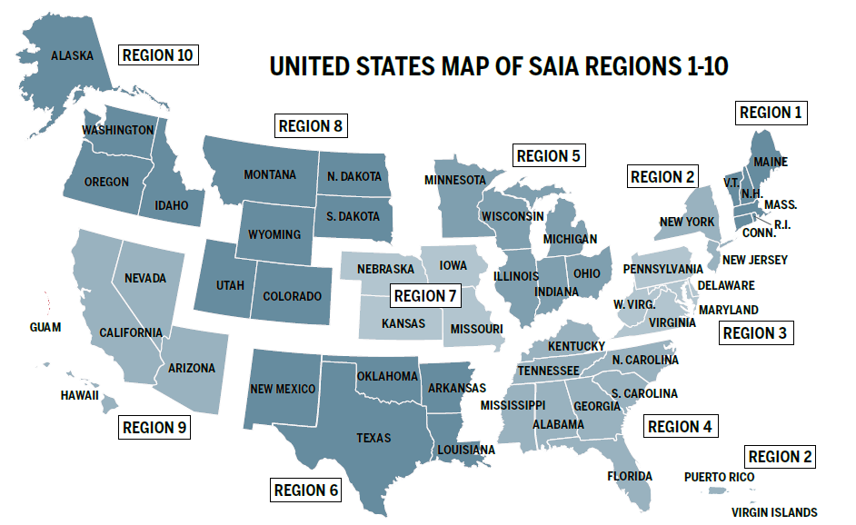 SAIA membership is segmented into 11 regions (including international) that mirror those of OSHA. Each region votes for its board of director representation. According to the SAIA by-laws a region is awarded 1 board member for every 15 voting member or a fraction thereof.